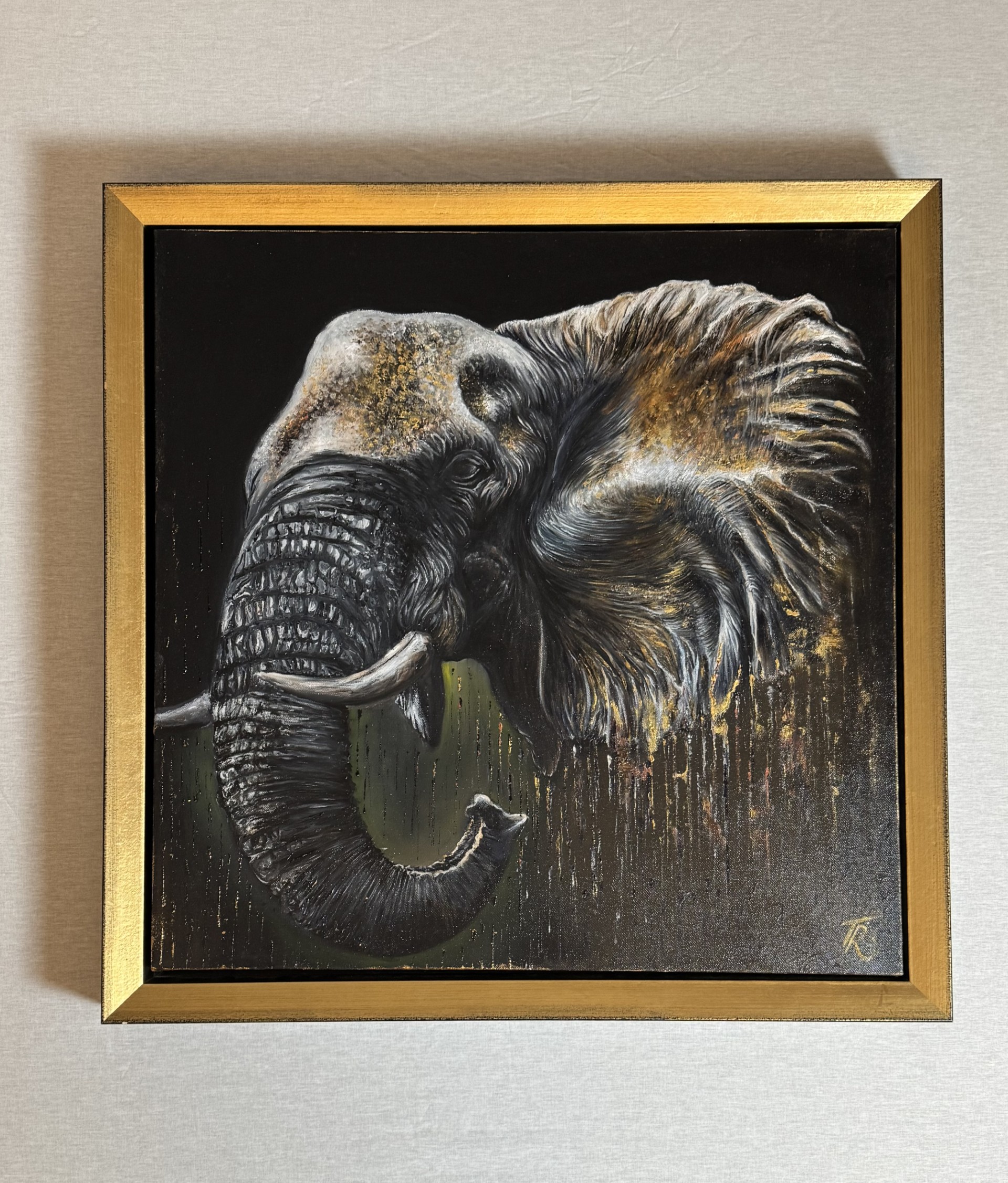 An old elephant stands with quiet majesty, each wrinkle and fold of its skin telling the story of a lifetime in the wild. Its eyes carry the weight of experience, wisdom, and memories of distant landscapes. Textured brushstrokes bring depth and movement, capturing both the strength and gentle vulnerability of this ancient creature. The painting is a tribute to resilience, grace, and the enduring spirit of the natural world.