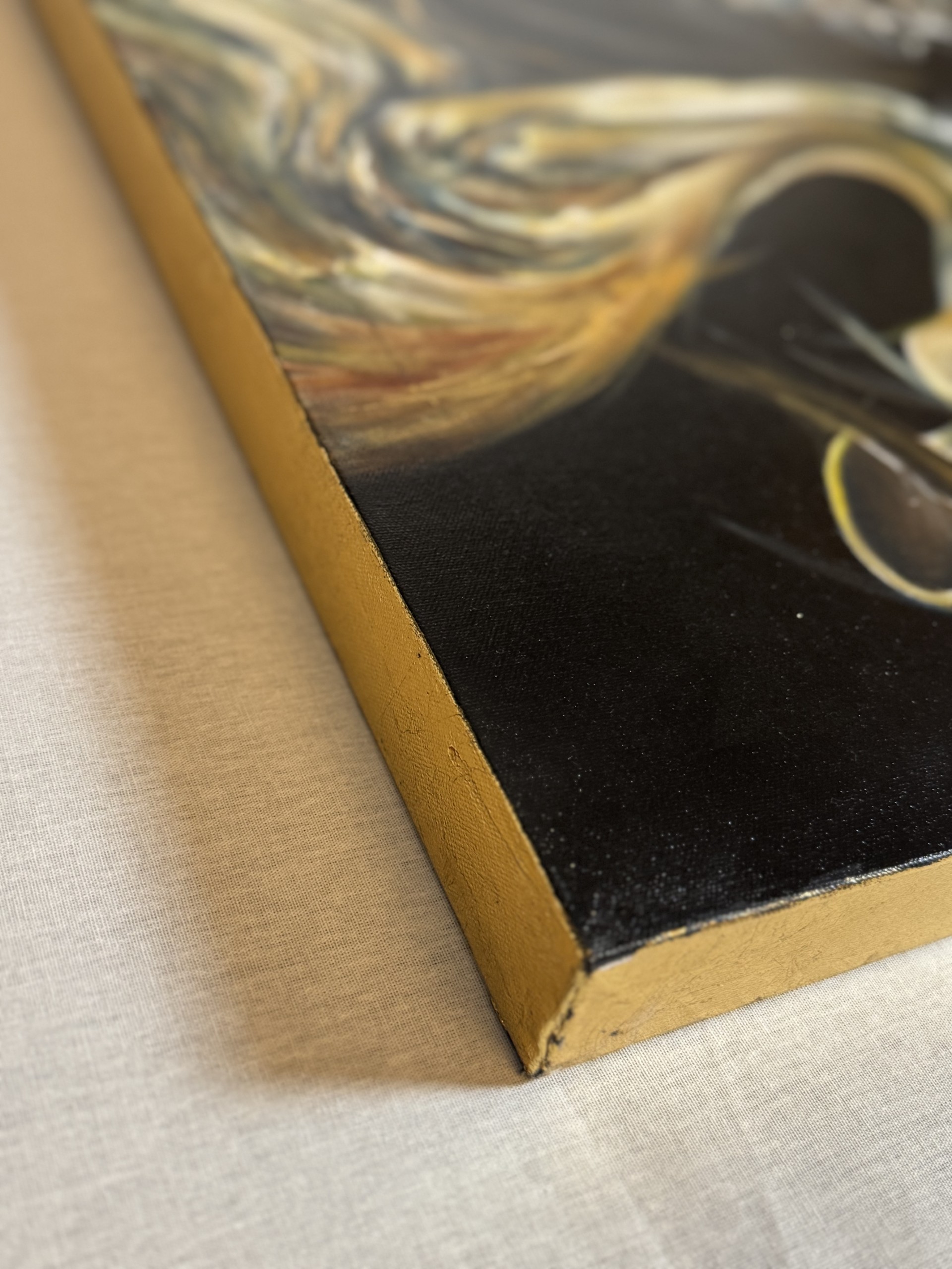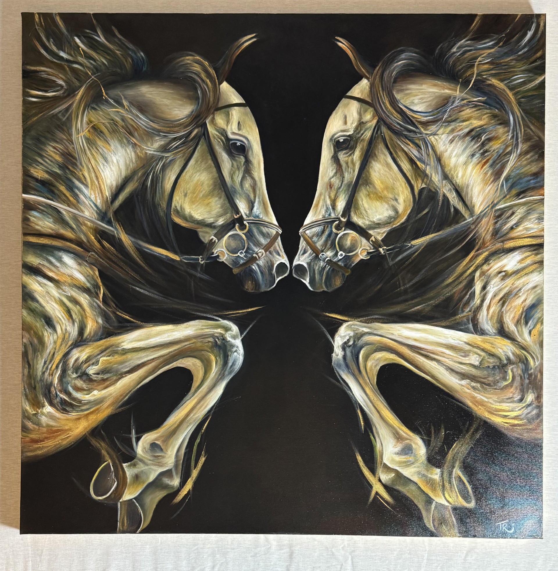 A sweeping oil canvas holds two identical horses, poised like mirrored spirits, facing one another in silent communion. Their forms rise from the brushstrokes as if summoned from mist with muscles carved in amber light, coats shimmering with the soft glow of dawn. Their manes drift backward like dark silk caught in a gentle wind, each strand painted with the tender patience of an artist listening to the heartbeat of the scene.