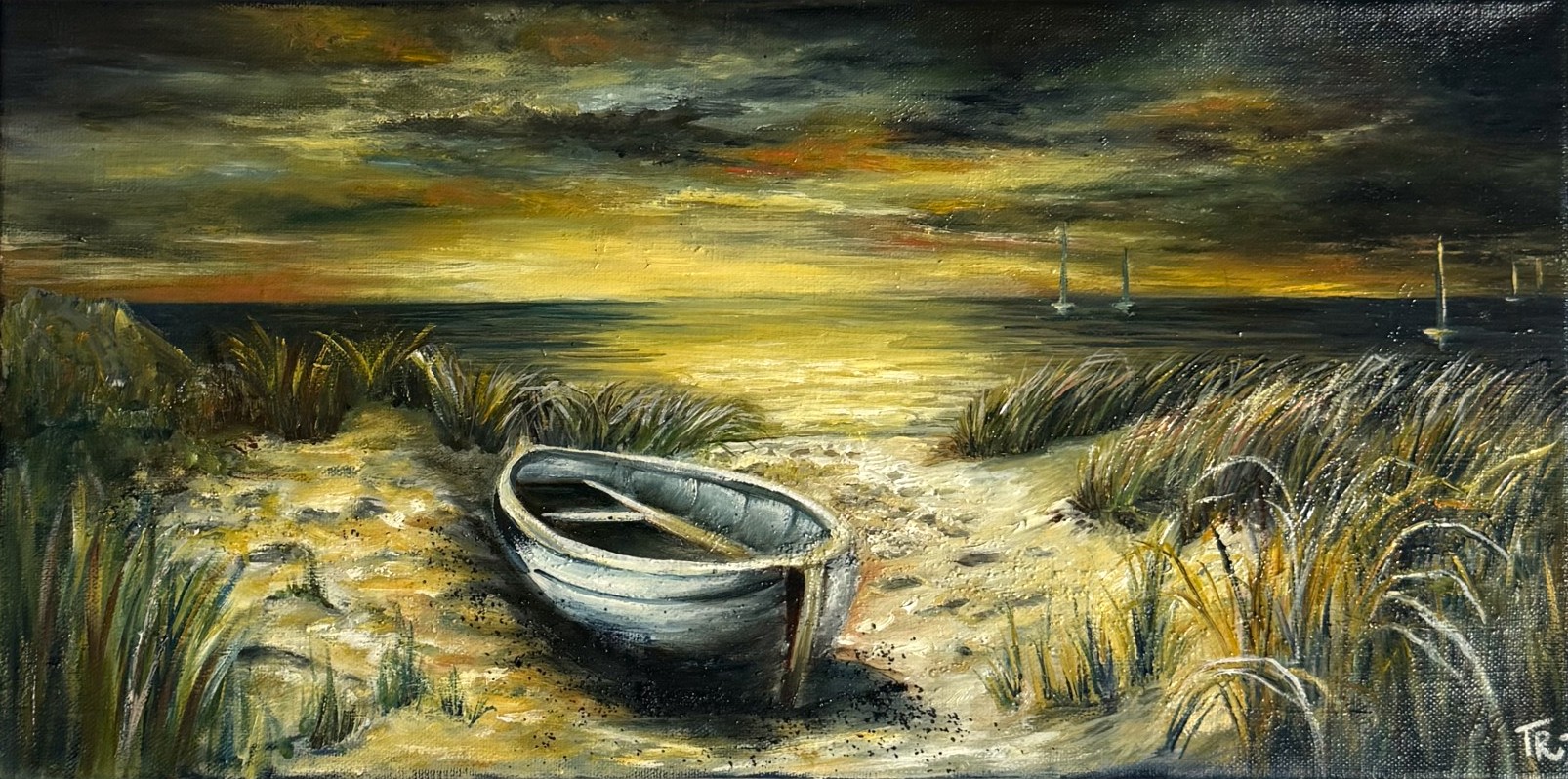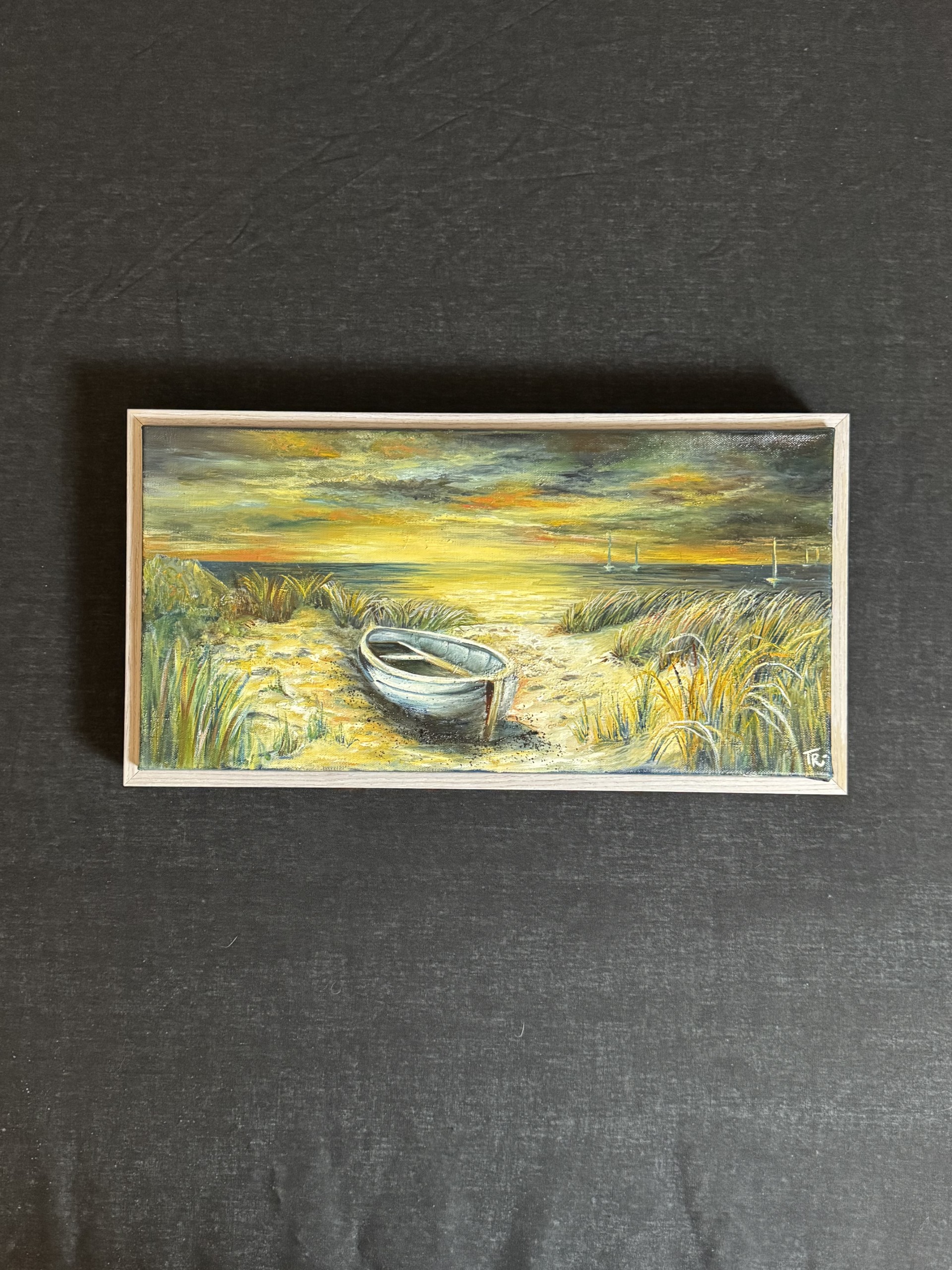 A solitary boat rests quietly on the sand, bathed in the warm, golden glow of the setting sun. Gentle reflections shimmer across the shoreline. The painting captures the stillness of this fleeting moment—the hush of the tide, the soft textures of sand and wood, and the serene beauty of day’s end. It is a meditation on calm, solitude, and the gentle rhythm of nature.