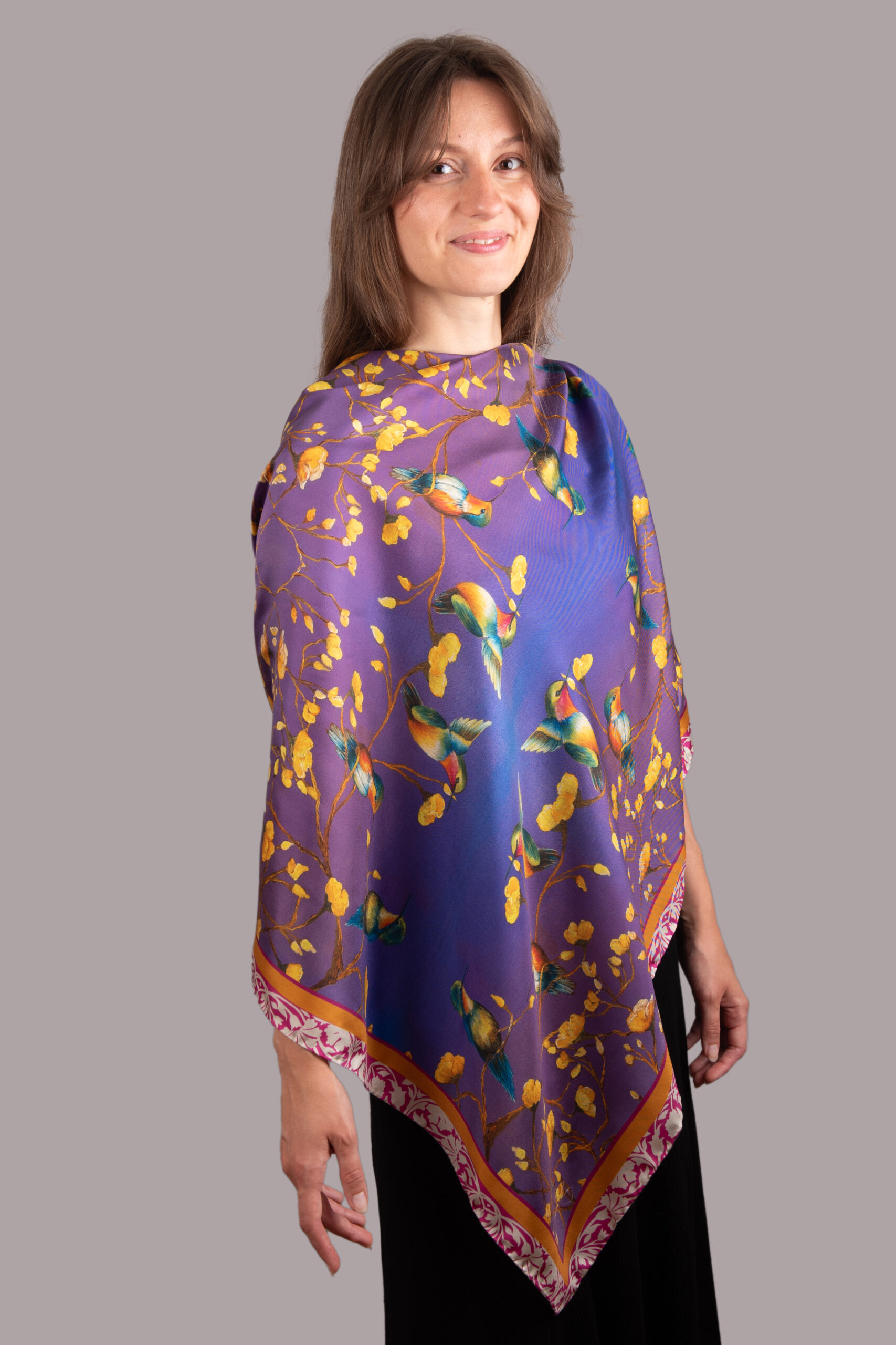 Crafted from 100% silk twill, the scarf offers a smooth yet textured feel, a subtle sheen, and a graceful drape that brings the painting’s colours and brushstrokes to life. Hand-finished edges complete the piece with refined craftsmanship.